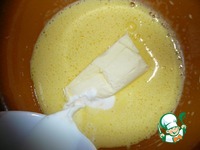 Добавить теплое молоко и размягченное масло. Снова взбить. |