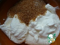 Теперь займемся кремом. Смешиваем сахар, мягкий творог и 4 ст. л. сиропа, в котором варился апельсин. |