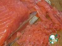 Рыбу подморозить в морозильной камере 15 - 20 минут, нарезать тонкой соломой и очень мелко порубить. |