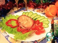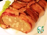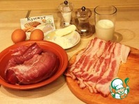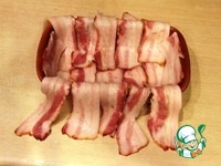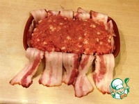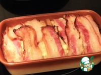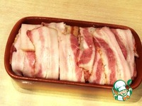 В прямоугольную или овальную форму выстлать ломтиками бекон (я заменила грудинкой), чтобы концы свисали. |