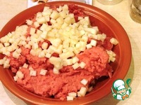 Выложить фарш в тарелку, добавить сыр, нарезанный кубиками, и перемешать. |