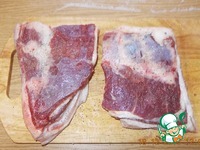 Два куска будут вариться вместе. Солим, перчим, ножом делаем прорези и шпигуем чесноком. |