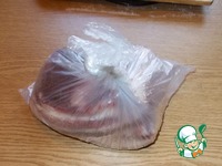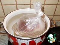 Оба куска кладем в один пакет, добавляем лавровый лист и завязываем узел, затем в другой, и так же - на узел. Получается пакет в пакете. (Важно, чтобы пакеты были цельные.) |