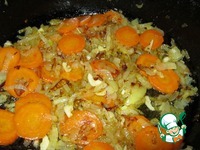 Лук шинкуем полукольцами или кубиком, морковь - кружком или натираем на тёрке - кто как любит. Обжариваем на растительном масле до готовности, Добавляем рубленый чеснок (можно продавить через пресс).