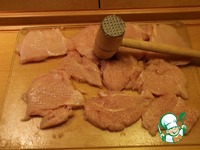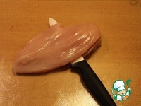 Придавливая рукой, куриное филе разрезаем вдоль. |