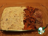 Смазываем жаропрочную форму оливковым маслом. На дно укладываем куриную грудку, поливаем соком из половины лимона, прикрываем слоем морковки с луком и поливаем соусом: майонез+йогурт. |