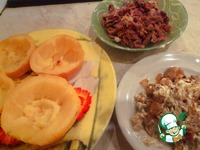 Потушить грибы с луком и сметаной. Готовую баранину мелко нарезать, Айву разрезать пополам и вынуть мякоть, оставив стенки. |