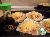 Смешиваем мясо с грибами, добавляем 2 ст. л. соевого соуса фирмы Kikkoman, сушеный базилик, перец, чеснок. |