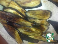 Ломтики синеньких обжарить с двух сторон до румяного цвета. Переложить на бумажное полотенце, чтобы впиталось лишнее масло. |