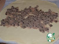 Подошедшее тесто раскатываем слоем примерно в 0,5-1 см. На середину теста выкладываем равномерно начинку. |