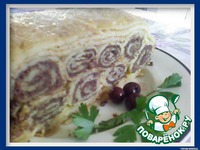Все накрыть тремя блинами,смазать майонезом и поставить запекать,в розогретую духовку приблизительно минут 25. |