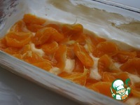 На дно формы, смазанной маслом, выложить часть теста, сверху выкладываем отваренные в сиропе мандарины |