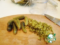 Ну и сразу можно подготовить соус - конечно, если рулеты вы не собираетесь подавать через 3 дня! Итак - очень мелко режем все ингредиенты и начнем с корнишонов. |