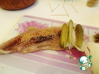 Каждое филе посыпаем зернами горчицы, закладываем немного репчатого лука, и разрезанные вдоль маринованные огурчики |