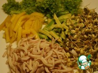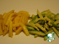 Берем манго и авокадо, очищаем, нарезаем каждый соломкой. Каждого фрукта нам потребуется по половинке. Авокадо сбрызнуть лимонным соком - чтобы не потемнел. |