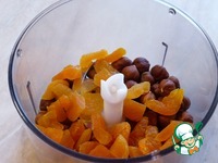 Поместить в чашу блендера орехи фундук и нарезанную курагу. |