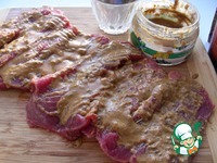 Выкладываем мясо на лист фольги и сворачиваем в рулет. |