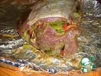 Разворачиваем мясо и выкладываем тушёные овощи. |
