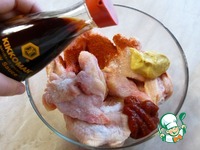 Перекладываем крылья в миску. Делаем маринад: посыпаем сахаром, добавляем горчицу «Дижонскую», парику сладкую, перец чили, соль, томатный соус (можно кетчуп) и соевый соус «Киккоман». |