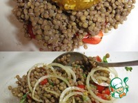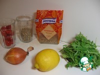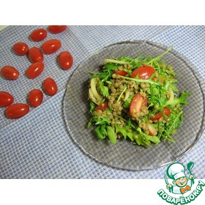 Для салата нам потребуются: зеленая чечевица (торговой марки Мистраль, разумеется), лук (красный или просто репчатый), помидоры черри, салат руккола, кинза, лимонный сок и уксус (белый винный или какой нравится).