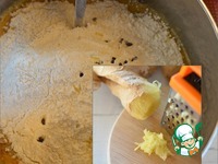 Просейте и добавьте муку и разрыхлитель. Натрите имбирь и добавьте к тесту. Так же добавьте кардамон. Хорошо перемешайте. Тесто получается густое, но льющееся. |