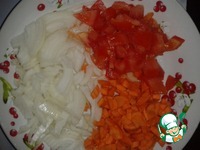 Лук режем полукольцами, морковь и помидор маленькими кубиками. |