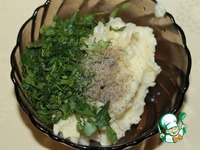 Отварной картофель размять, посолить, поперчить, добавить размолотый чеснок и мелко порубленную зелень |