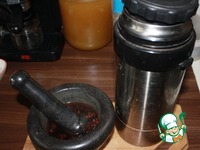 Отвар без ягод сразу перелить в термос. Сваренные ягоды барбариса потолочь в ступке или просто подавить ложкой и отправить также в термос |