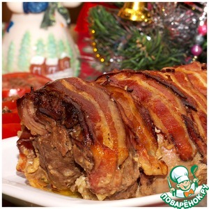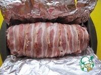 Обернуть полосками бекона. Форму застелить фольгой, выложить рулет. |