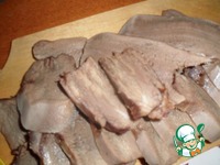Отвариваем до готовности язык и нарезаем его порционными кусками |