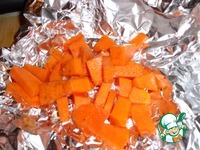 Начнем приготовление соуса: тыкву порежем на кусочки, посолим и поперчим, добавим немного оливкового масла и отправим в духовку на 30 минут при 180 градусах. |