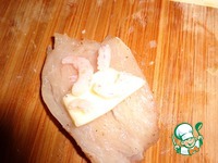 Кусочки куриного филе натрем солью и специями и слегка отобьем. На каждый кусочек положим креветку и брусочек твердого сыра. |