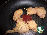 Скрепим кусочки с помощью зубочистки. Затем окунаем каждый рулетик в яйцо и обваливаем в панировочных сухарях, слегка обжариваем. |