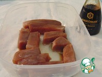 Тунец порезать на кусочки толщиной 2-3 см, положить в тарелку, сбрызнуть соевым соусом и 1 ст. ложкой оливкового масла. |