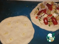 Тесто разделить на порции и размять руками или слегка раскатать. Раскидать пластинки чеснока. |