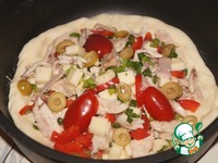 Сверху выложить начинку, на нее несколько половинок черри. |