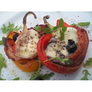 Разрезать моцареллу на 4 ломтика и разложить на перец. Поставить в духовку на 5 минут. Выложить на блюдо, украсить листьями рукколы и оливками. |