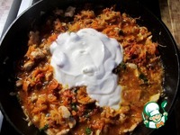 Добавить овощи к мясу, влить воду и томатную пасту. Перемешать, накрыть крышкой, начать тушить. |