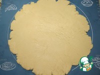 Затем достаю тесто из морозильной камеры, с помощью скалки раскатываю круг, накручиваю тесто на скалку и так переношу тесто в форму для выпечки. |