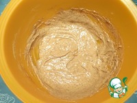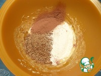 Добавляю муку, просеянную с разрыхлителем, какао-порошок, измельченный в крошку фундук. |