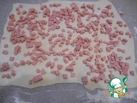 Далее нарежьте колбасу кубиками. Сыр натрите на крупной тёрке. Оливки нарежьте тонкими кольцами. Подготовленные ингредиенты выкладывайте на тесто слоями. Начните с колбасы. |