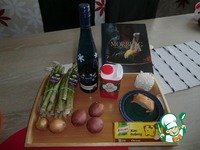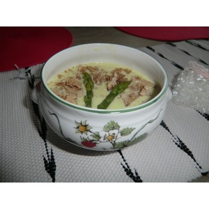 Супчик готов! Положить в тарелку пару вершков спаржи и сухарики. В оригинальном рецепте нет филе и картофеля. |