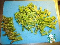 Порезать спаржу на кусочки в 1-2 см (кроме вершков - их мы оставляем на украшение). |