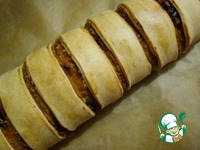 Скатать рулет, выложить на противень швом вниз. Можно смазать взбитым яйцом с сахаром, я смазывала просто яйцом |