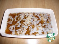 Мясо нарезаем мелкими кусочками, распределяем равномерно в форме. Заливаем процеженным бульоном. |