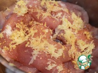 Добавляем к мясу соль, сахар, соус, перец, чеснок, имбирь, натёртый на мелкой тёрке, хорошо перемешиваем, закрываем крышкой и оставляем на 3 часа при комнатной температуре |