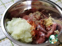 Лук - измельчила блендером, чеснок пропустила через пресс, добавила к фаршу. Поперчила, посолила, приправила травками, добавила молоко. |