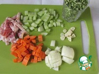Ингредиенты для супа: лук, чеснок, морковь, сельдерей, бекон нарежем произвольно. Приготовим стакан гороха. Зеленый колотый горох не нужно замачивать заранее, он варится быстро. |