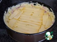 Первым делом варим картофель в мундирах. Когда картофель еще теплый, чистим и давим его в пюре. Затем нарезаем ветчину небольшими кубиками, сыр - пластинками, моццарелу - кружочками. |