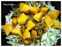 Отвариваем до полу готовности рис и кладем поверх капусты вместе с нарезанной средними кубиками тыквой. |